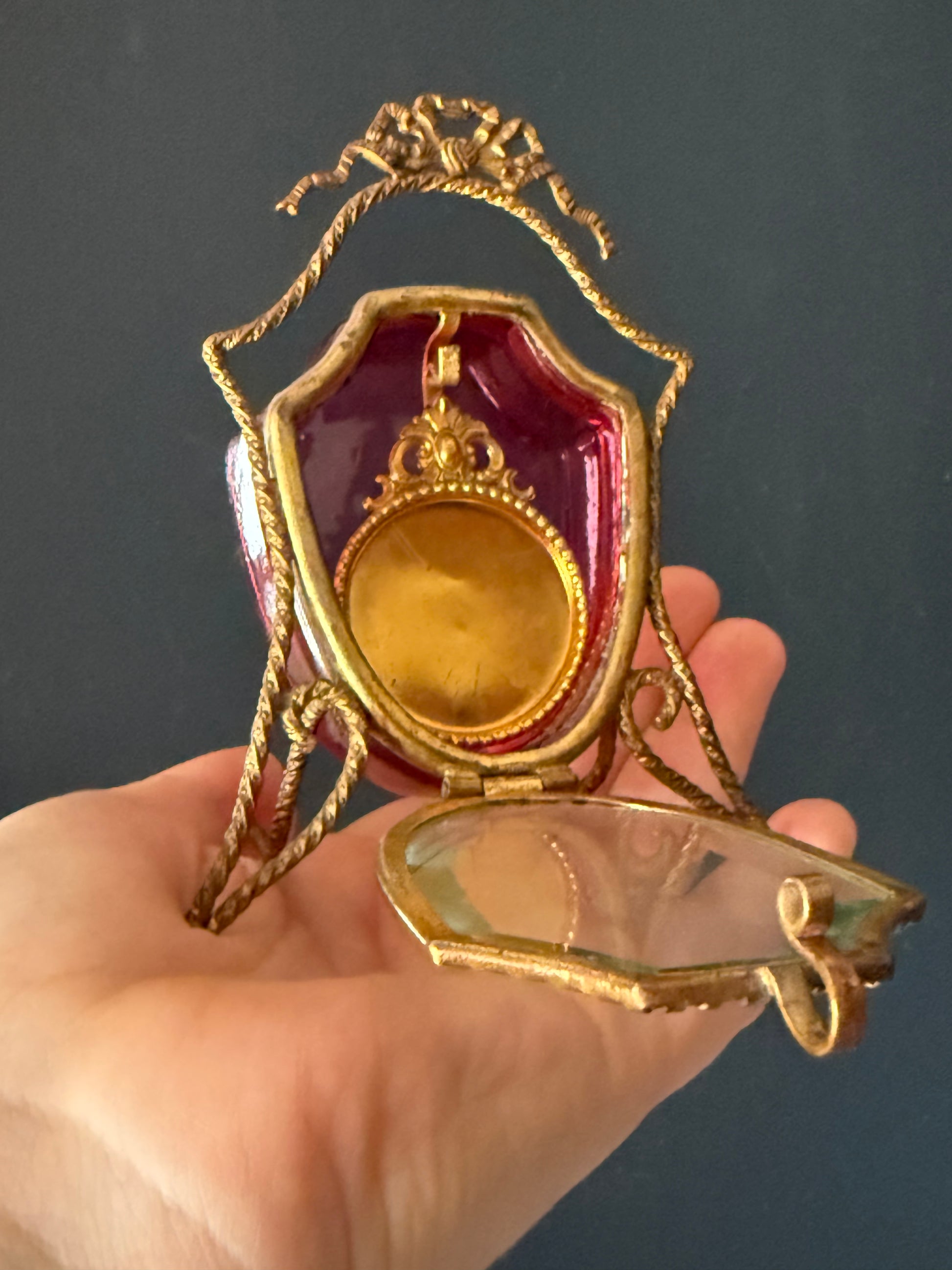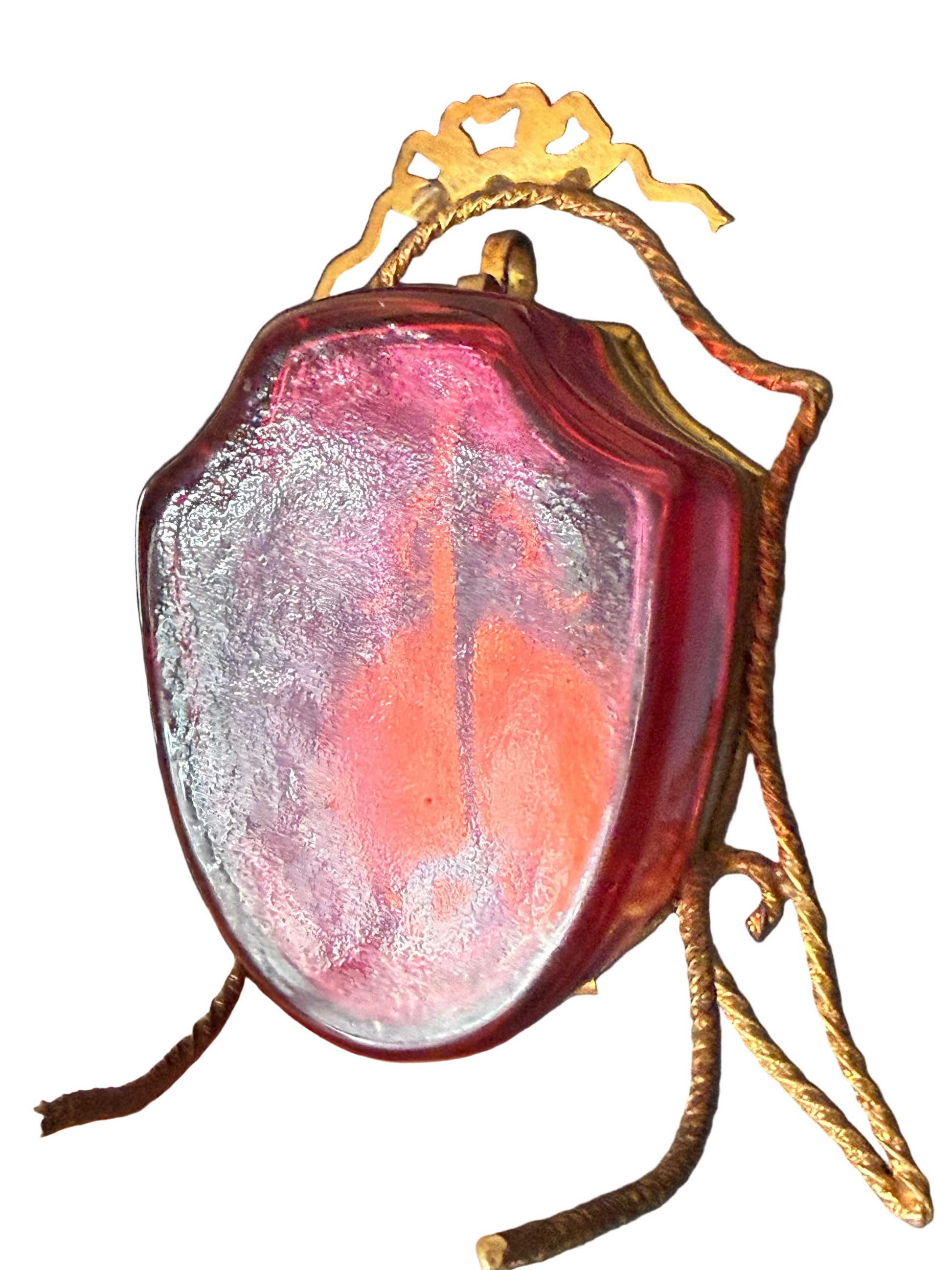 Bring a touch of 19th-century French elegance into your collection with this exquisite cranberry glass antique pocket watch stand. Expertly crafted from solid brass and beveled glass, this rare Victorian-era piece features beautifully detailed filigree work with delicate floral-inspired ornamentation.